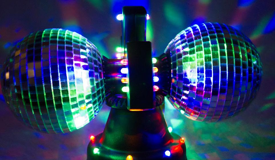 Double boule à facettes - Rotative - Miroir - Puissance 8W. Illuminez vos soirée d'un scintillement des LED multi-couleur qui se reflètent dans les boules à facette qui tourne sur elle même.